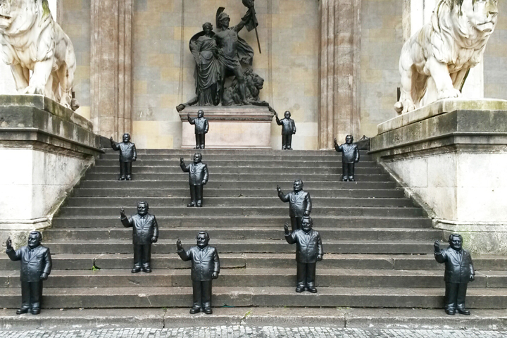 Mit einladender Geste tauchten sie spontan allein und in Gruppenformation an diversen Münchener Plätzen wie der Residenz, dem Marienplatz, der Oper oder der CSU Zentrale auf. Als Geschenk an die Öffentlichkeit blieben sie stehen, bis sie von Passanten mitgenommen wurden, in einen Garten, ein Wohnzimmer, ein Büro…
