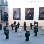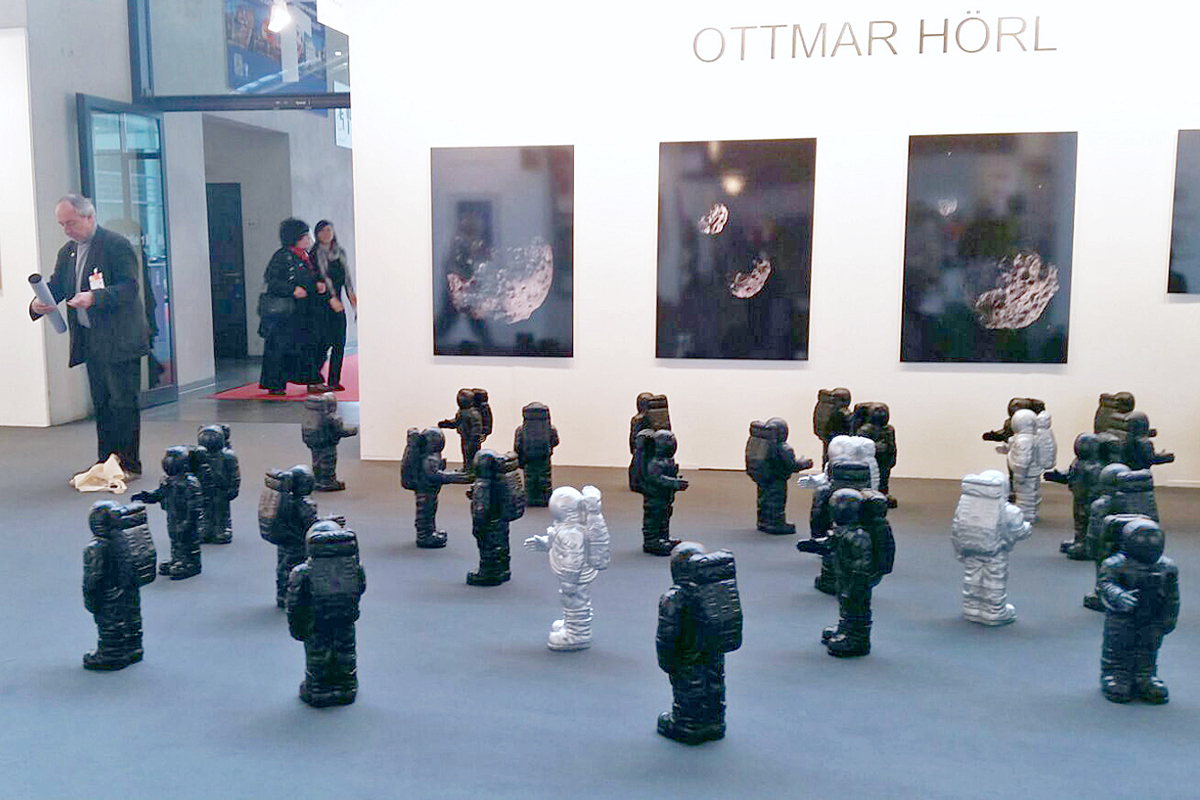 Anlässlich der 13. art KARLSRUHE stellt Ottmar Hörl das Thema Welt-Raum-Forschung in den Mittelpunkt seiner Präsentation. So wird der White Cube des Messestands zum Schauplatz einer skulpturalen Invasion und zum Ort der besonderen Begegnung: Serielle Astronauten-Wesen erobern den Raum und strecken Besuchern die Hand zur Begrüßung entgegen.