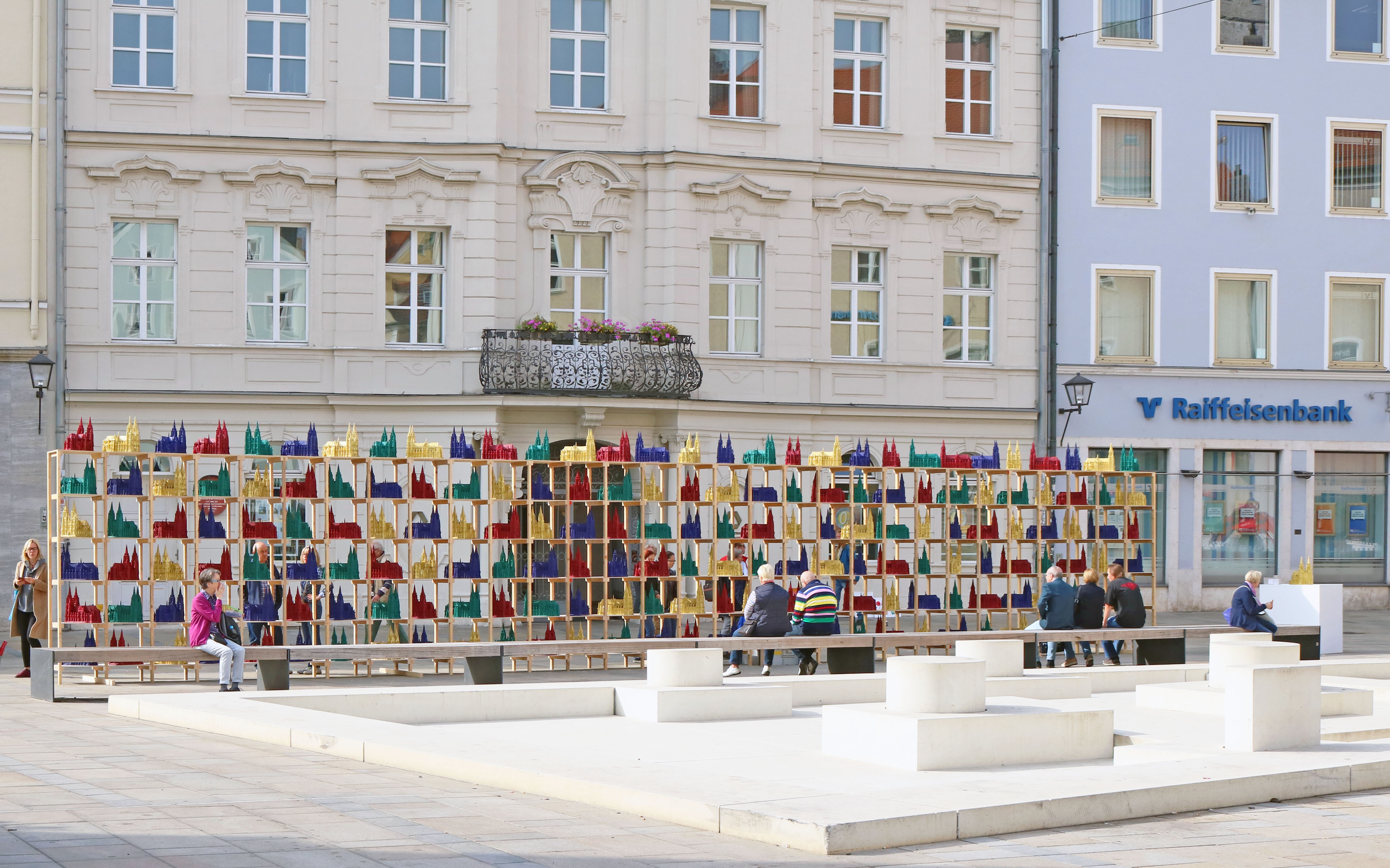 Ottmar Hörl eröffnet mit seiner neuen Installation einen Raum zwischen dem gotischen Bauwerk St. Peter und seiner Vermarktung als Andenken. Mit 150 farbigen Domplastiken aus Kunststoff, akkurat angeordnet in einem 15 Meter langen und 3 Meter hohen Regal, wird das Bauwerk ganz neu erfahrbar: Größer als gängige Souvenirs, haben die Plastikskulpturen Modellcharakter. So können die Betrachter Details der gotischen Architektur ganz anschaulich erfahren, ertasten und in Augenschein nehmen: Die Türme, Strebebögen, Fialen und Widerlager – alle Charakteristika der Gotik. Was sonst nur eine Drohne sieht, wird nun durch die Skulpturen für den Betrachter sichtbar. Durch diesen ungewöhnlichen Blickwinkel werden die Plastiken auf ganz neue Art Botschafter der Stadt Regensburg.