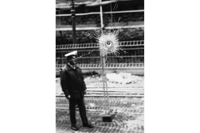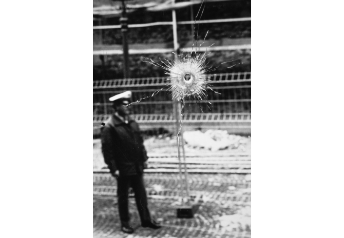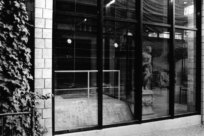 Bekanntlich fallen in Frankfurt hin und wieder Schüsse. Die Mehrzahl der Treffer konzentriert sich eindeutig im Bahnhofsviertel. Museen und andere Bildungsinstitute gerieten bislang nicht unter Feuer. Jedenfalls nicht bis letzten September 1991. Am frühen Morgen des 12.09.1991 sperrten Polizeikräfte die Passage zwischen Nikolaikirche und Historischem Museum hermetisch ab, ein uniformierter Präzisionsschütze legte an, zielte und zog zweimal kurz nacheinander durch. Seither sitzen in der Glasfront des Museums zwei Einschusslöcher in genau berechnetem Abstand voneinander und exakt auf Kopfhöhe. Wer sich hinter eine der Scheiben stellt (der Bereich ist öffentlich zugänglich), kann sich für Augenblicke recht intensiv vorstellen, dass die horizontale Schussbahn mitten durch die eigene Stirn hätte verlaufen können, bevor das Projektil im rechten Winkel auf die rückwärtige Wand aufschlug. Eine Vorstellung, die vorübergehend ein durchaus intensives Existenzgefühl vermittelt: Dergleichen Schussbahnen ziehen auf diesem Globus unentwegt kurzlebige Kurven und Linien durch den leeren Raum und kreuzen dabei häufig bewegliche Ziele.