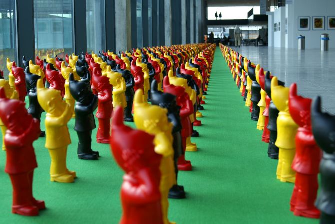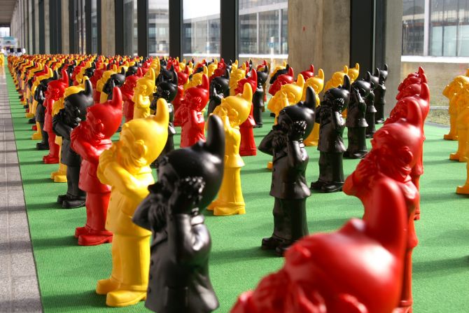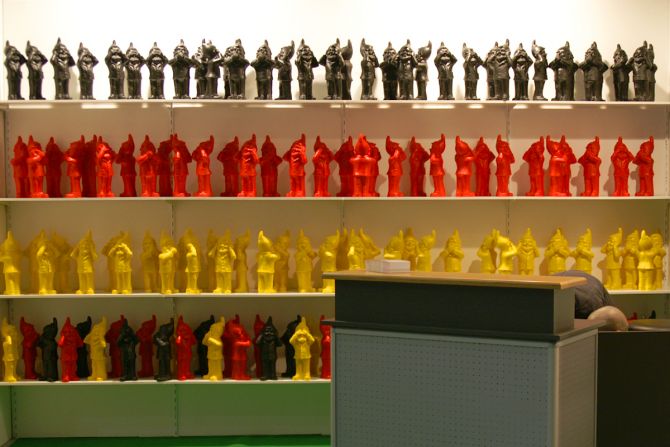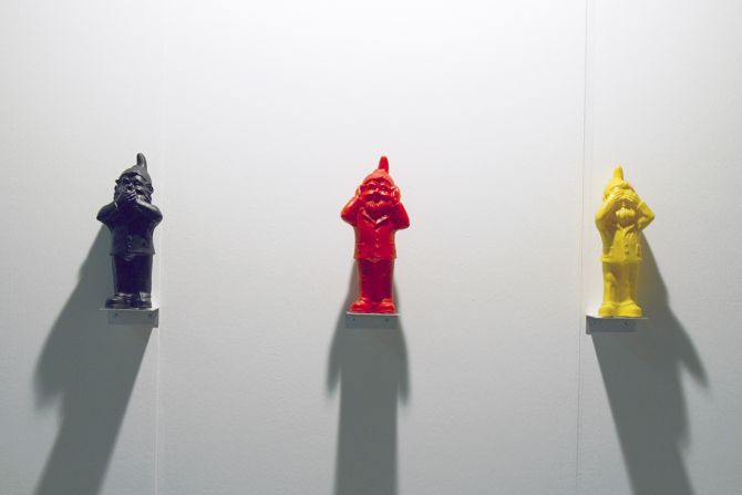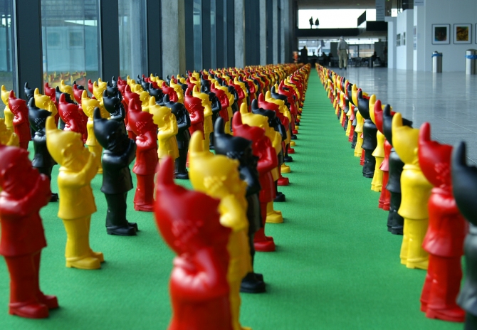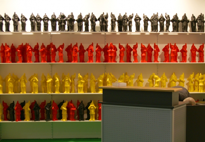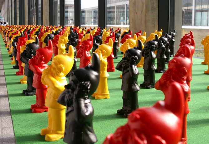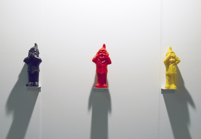 1200 Zwerge in den Farben schwarz - rot - gelb und den drei Haltungen „nichts sehen - nichts hören - nichts sagen“ wurden eigens für die Kunstmesse art Karlsruhe konzipiert. Prof. Hörl spricht von einer „sanften Provokation“, gerade in der Stadt des Rechts, und seine Zwergen-Parade, auf einer riesigen Holzkonstruktion im Rechteck aufgebaut, wird gewiss zum Schmunzeln führen. Die „relativ politische Idee“ (Hörl), die von jedem Betrachter nach Gutdünken interpretiert werden kann, zeugt von einer Kunst, die die Auseinandersetzung sucht, die sich nicht im geschützten musealen Ambiente verkriechen mag.