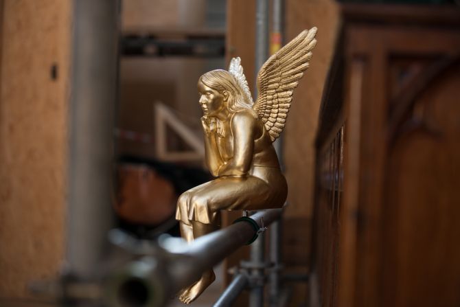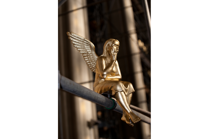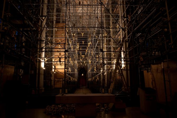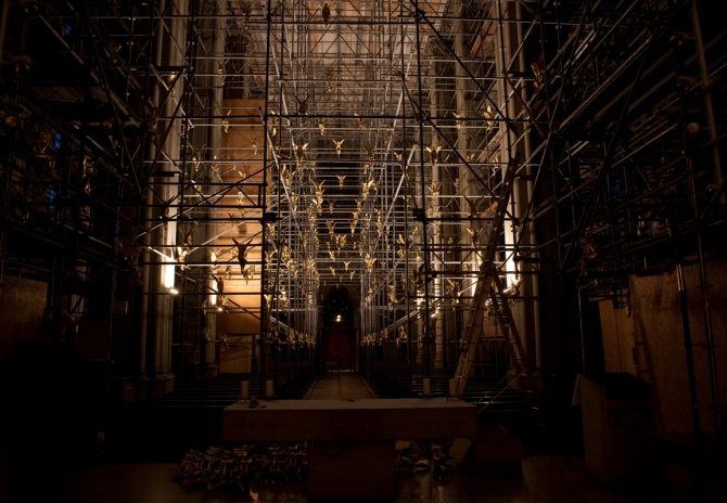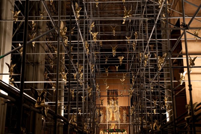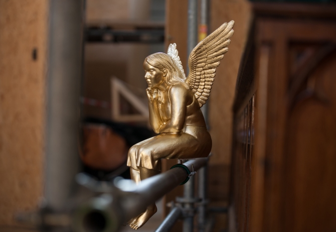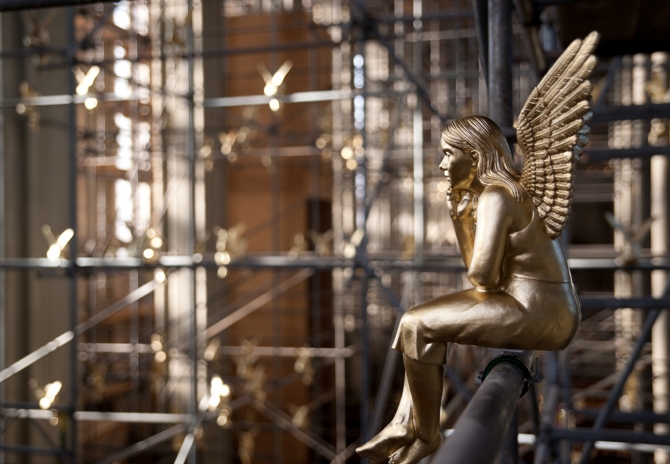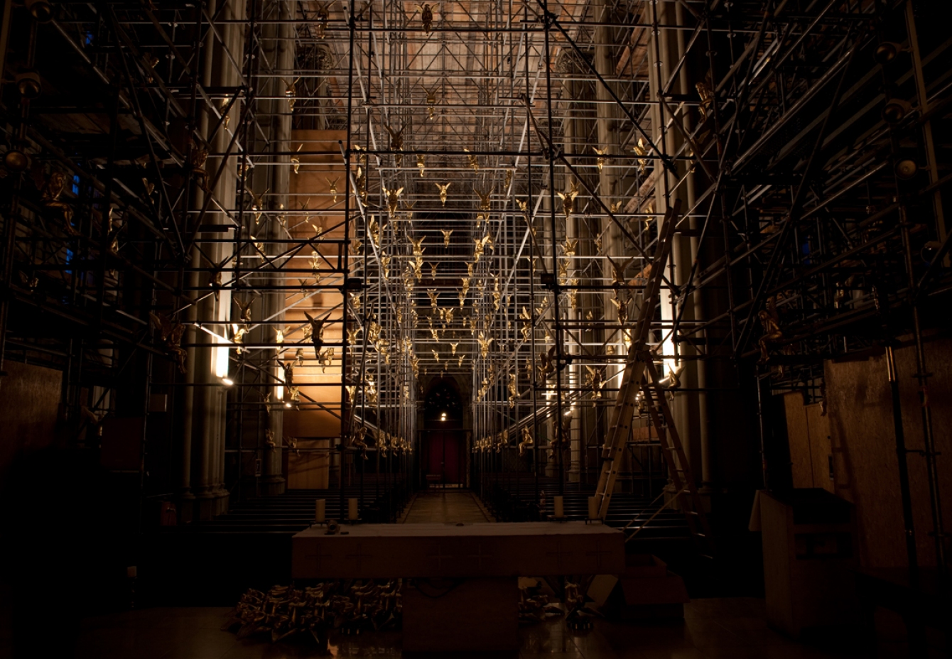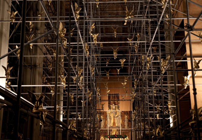 Der Innenraum der Heilig Kreuz Kirche in München-Giesing wurde für Renovierungsarbeiten völlig eingerüstet. Das Kirchenschiff gleicht einem Wald aus Gerüsten. In diesem Dickicht wurden mehrere hundert goldene Schutzengel installiert.