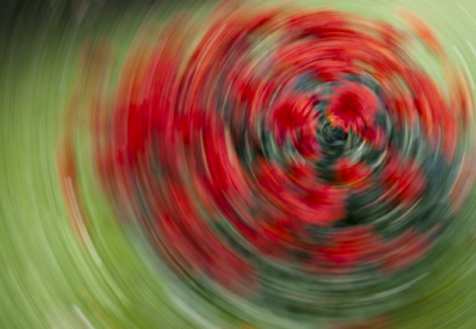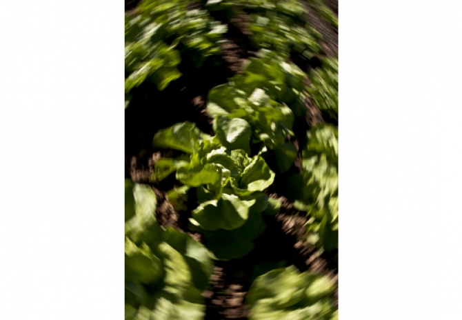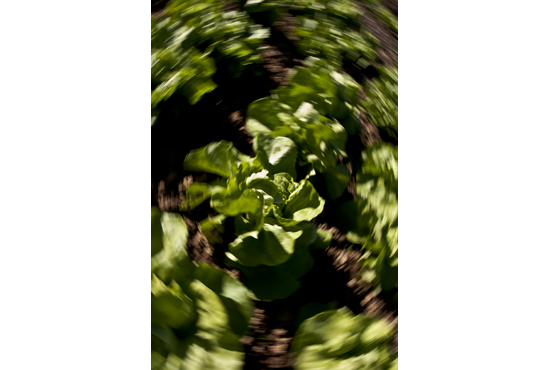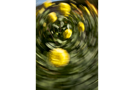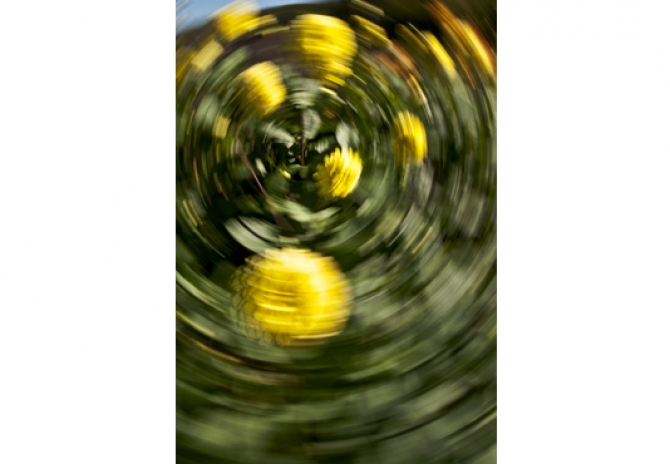 Für die insgesamt 36 noch analog realisierten Fotografien der Serie „Requiem für Vincent“ bewegte sich ein präparierter Fotoapparat, an ein Rad fixiert, an einem Sonnenblumenfeld entlang.