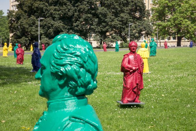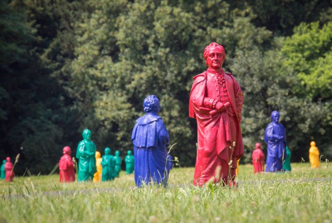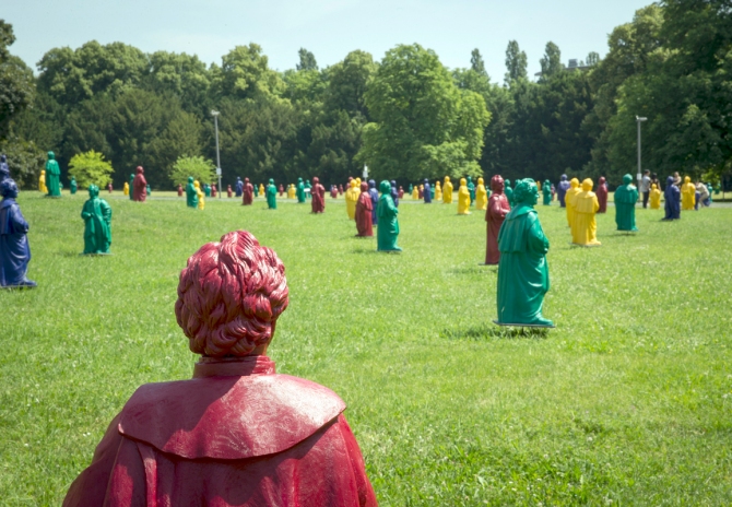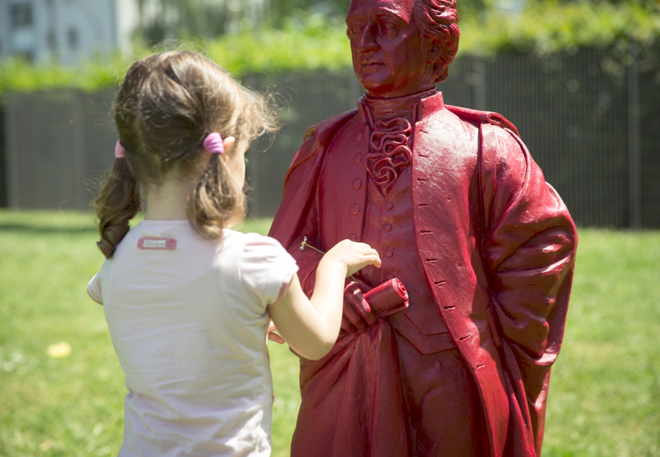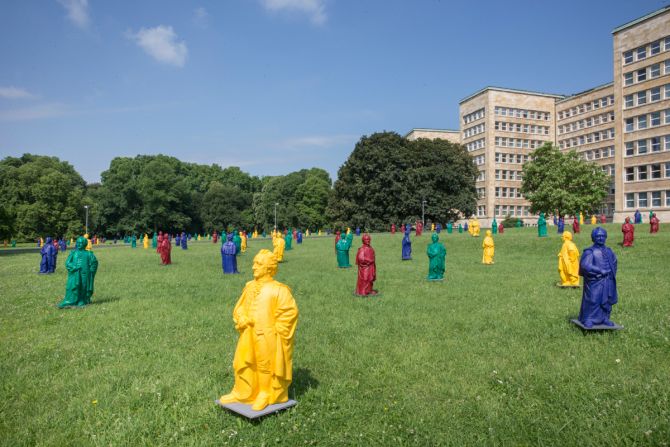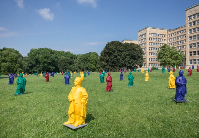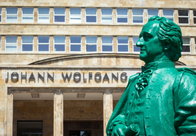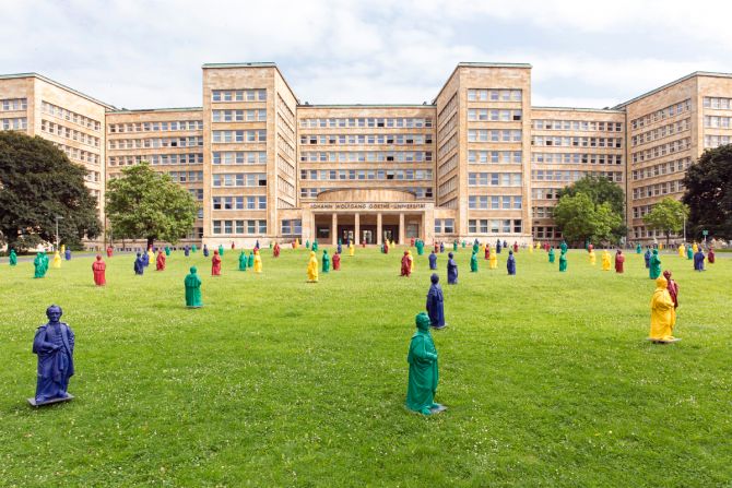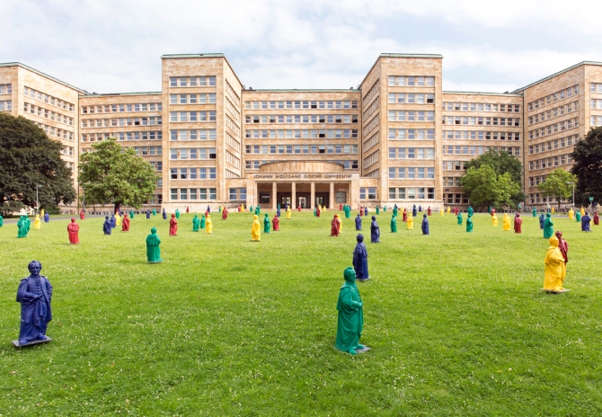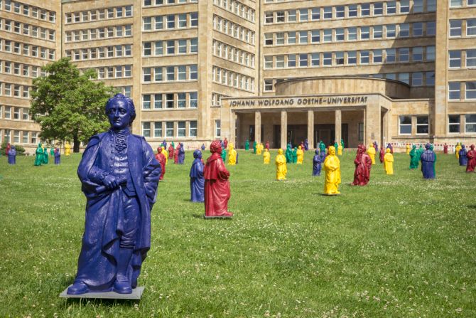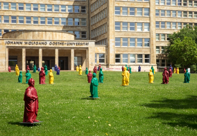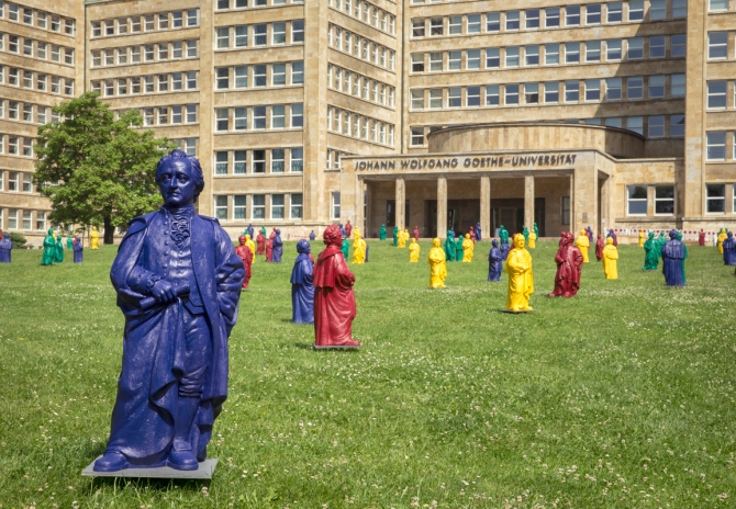 Das „große Jubiläum 2014“ bringt die Goethe-Universität als „wichtigstes Unternehmen in Frankfurt“ in einen besonderen Dialog zu den Bürgern der Stadt und der Region. Um eine Brücke zu einer „großen Öffentlichkeit“ zu kreieren, wurde der mit Frankfurt sehr verbundene Künstler Ottmar Hörl von Seiten der Universität zu einer Installation vor dem Haupteingang der Universität eingeladen. Damit wird Goethe in seiner Gesamtheit als Person, als Mensch, als Kulturträger und als Wissenschaftler in mehr als 400 multiplizierte Goethe-Figuren (in den Farben der historischen Fakultäten der Universität) eine Fläche definieren bzw. temporär prägen. Das Sehen und Erleben der Installation wird unmittelbar eine bewertende Verbindung auslösen und einen ganz persönlichen Erinnerungsmoment schaffen.