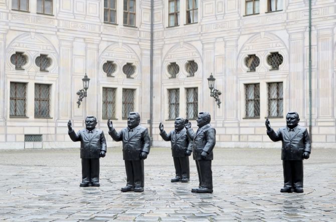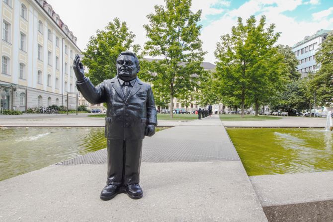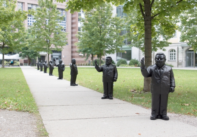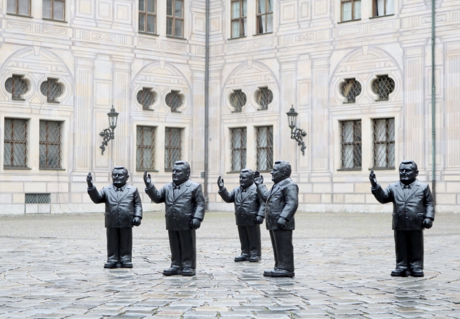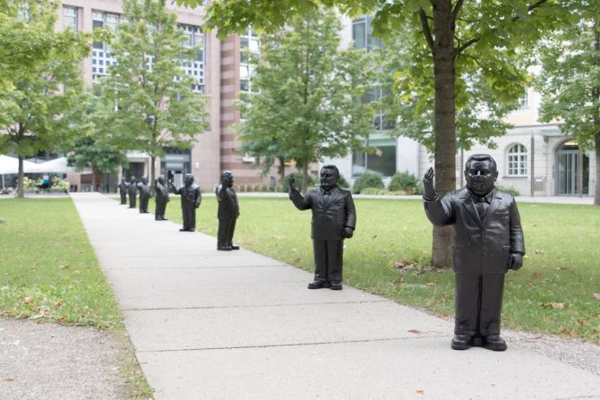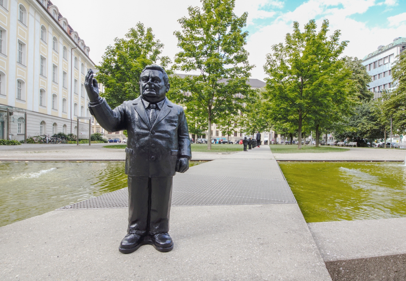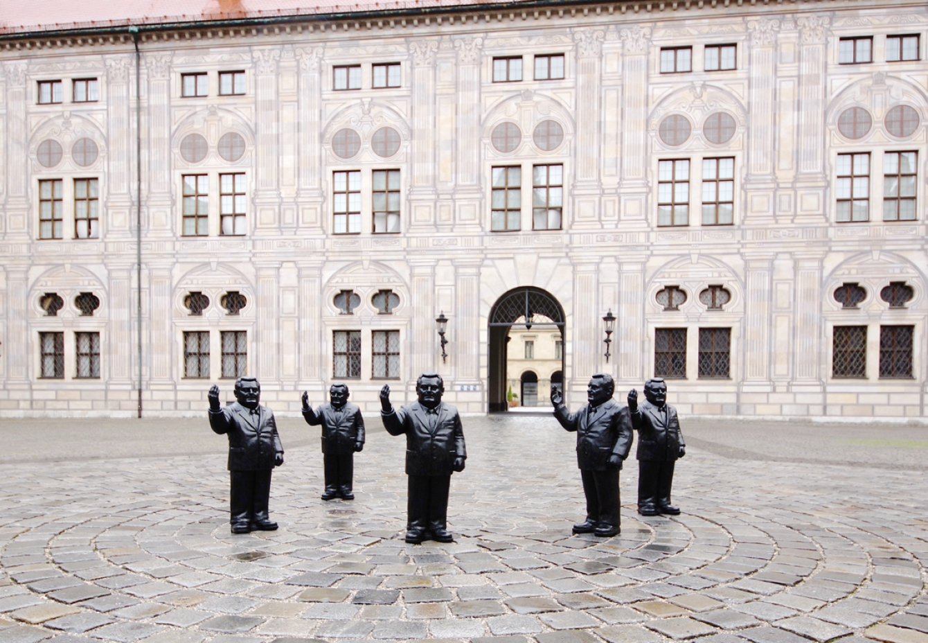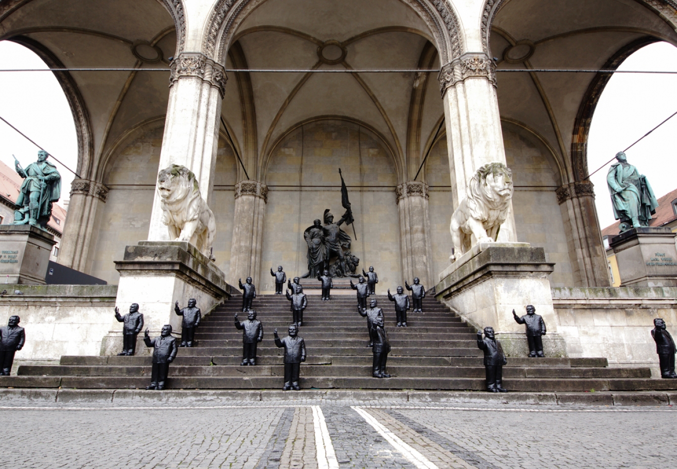 Mit einer spontanen Guerilla-Kunstinstallation aus mehreren Dutzend seriellen Franz Josef Strauß-Figuren macht Ottmar Hörl auf das Jubiläum aufmerksam und lädt zum Diskurs ein. So tauchen die Skulpturen mit einladender Geste spontan allein und in Gruppenformation an diversen Münchener Plätzen wie der Residenz, dem Marienplatz, der Oper oder der CSU Zentrale auf und verblüffen und begrüßen Münchener Passanten und Touristen.