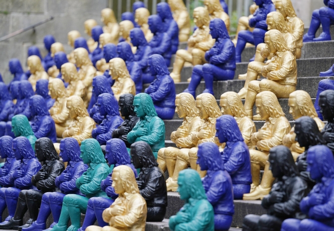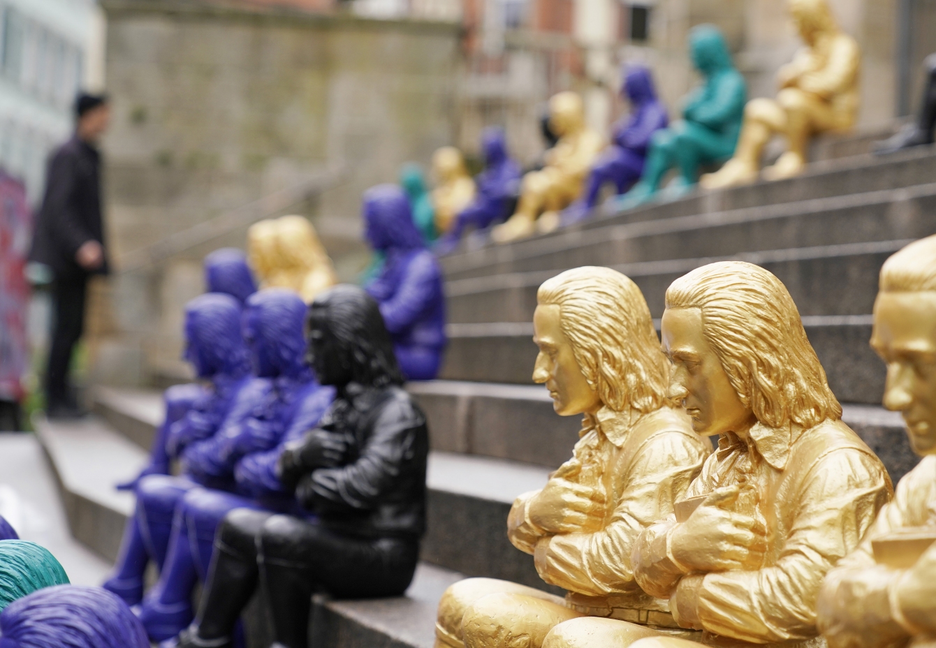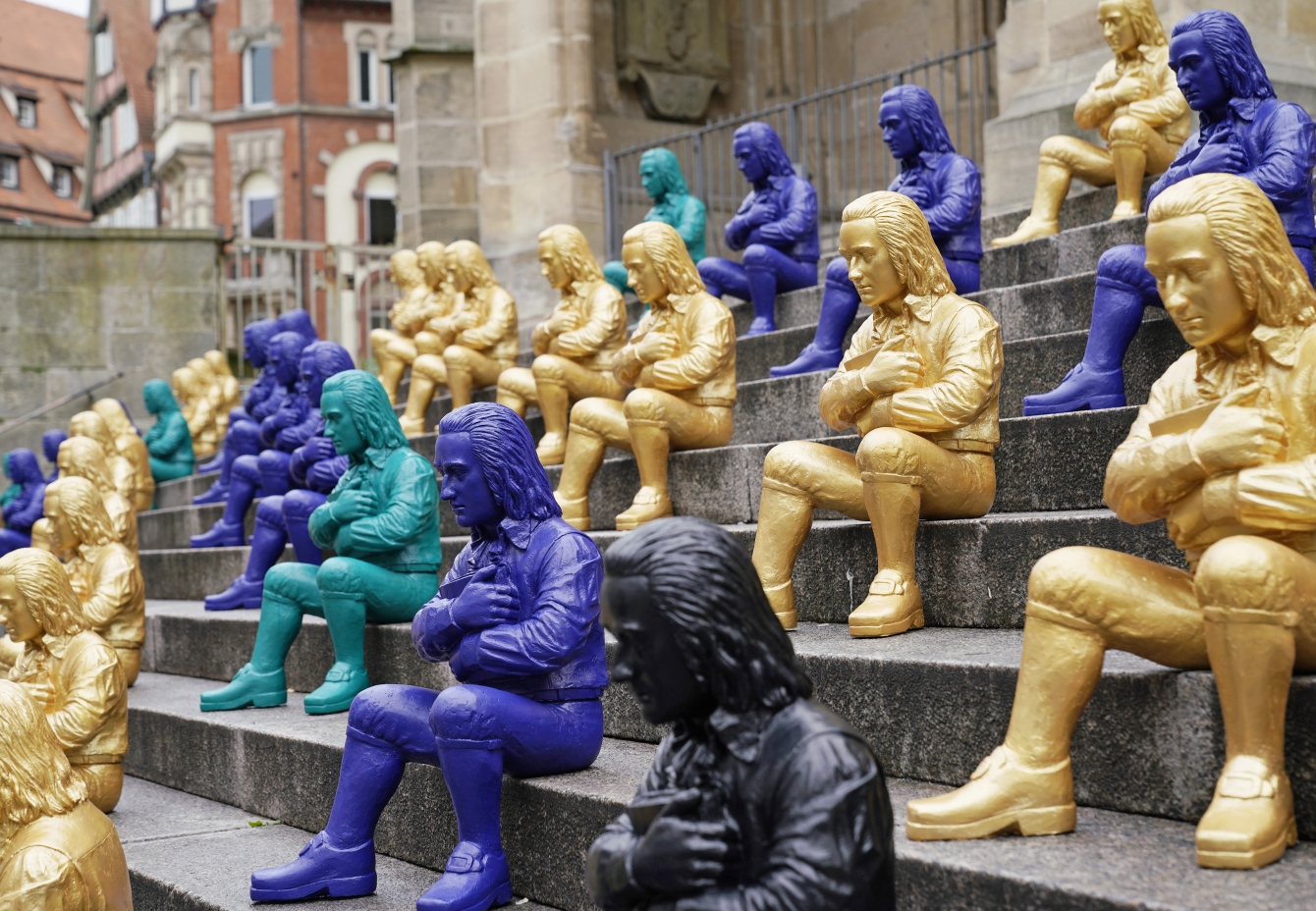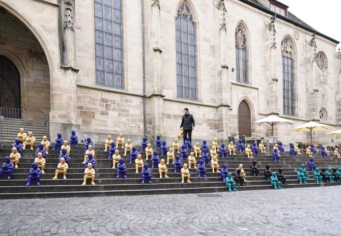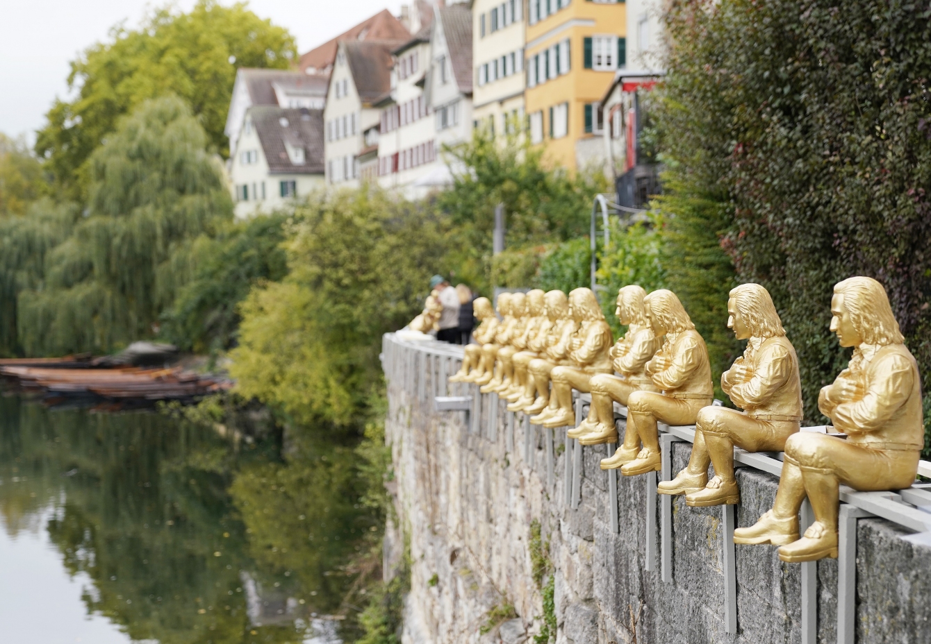 Insgesamt installiert sind rund 250 serielle, je 66 cm hohe Figuren in den monochromen Farbtönen Gold, Schwarz, Nachtblau und Opalgrün, und zwar vor der Stiftskirche sowie entlang der Neckarmauer zum Hölderlinturm, in dem der Dichter, aus der Zwangseinweisung der Klinik als „unheilbar“ entlassen, dann die zweite Hälfte seines Lebens (1807–1843) verbracht hat.